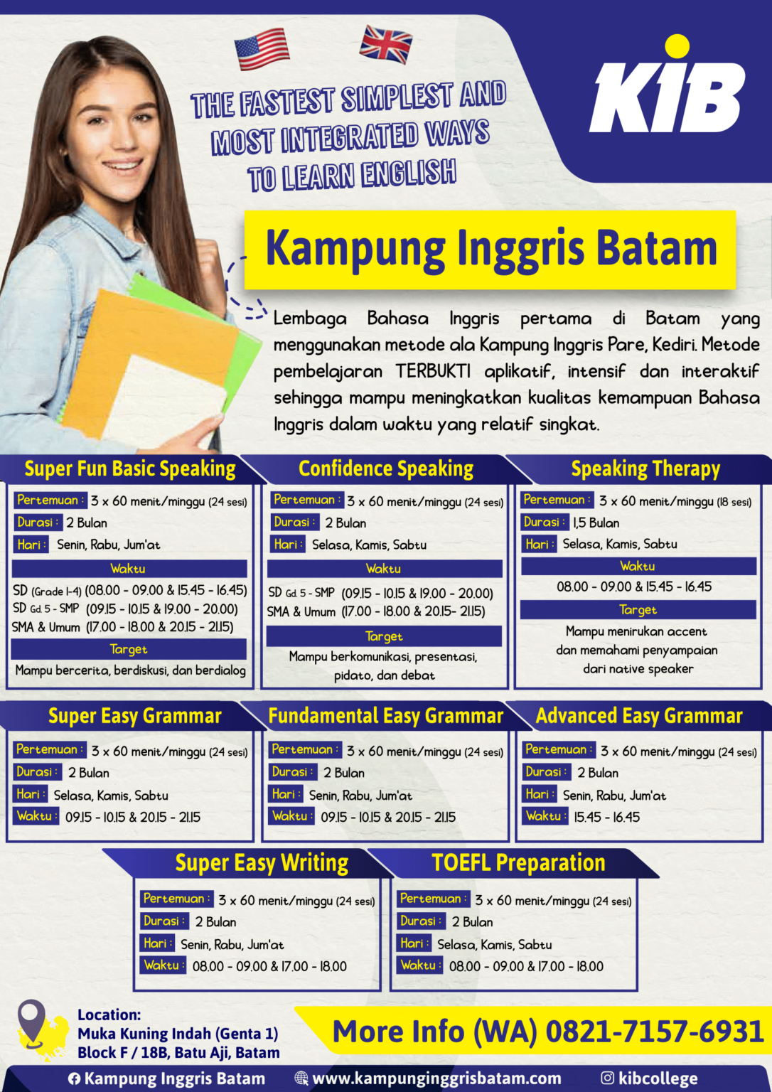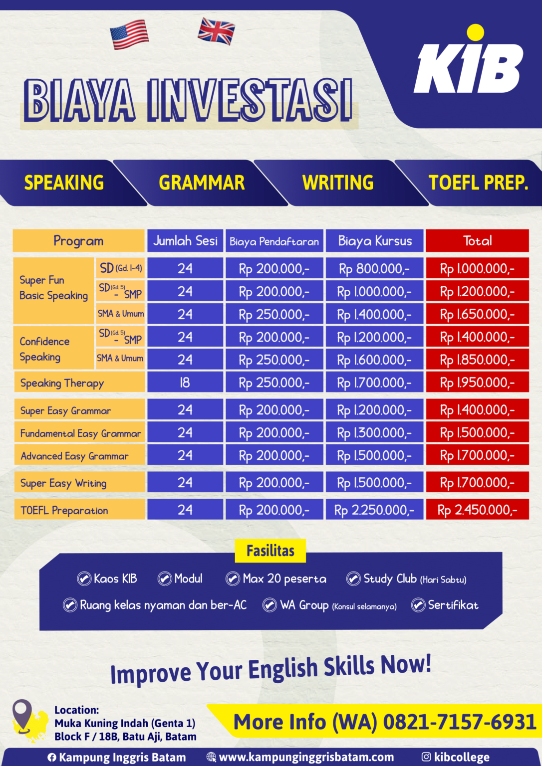 Dengan biaya investasi yang terjangkau, program kami menawarkan banyak fasilitas untuk memudahkan anda dalam meningkatkan kemampuan bahasa Inggris.